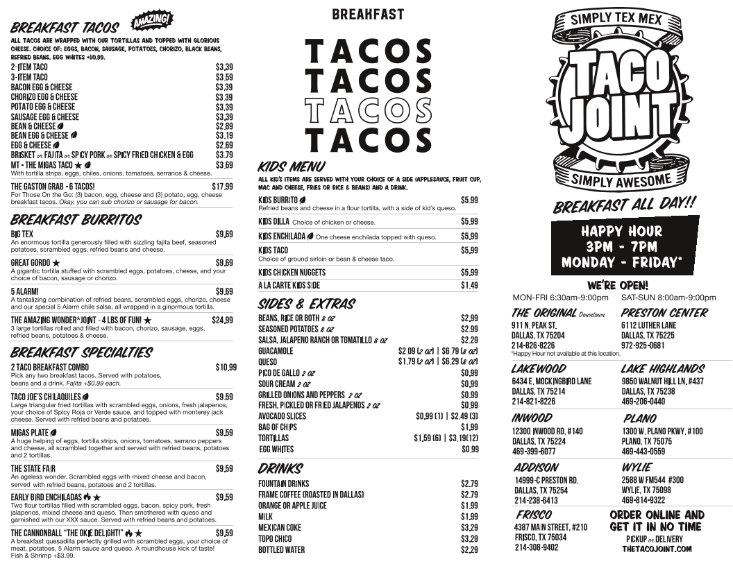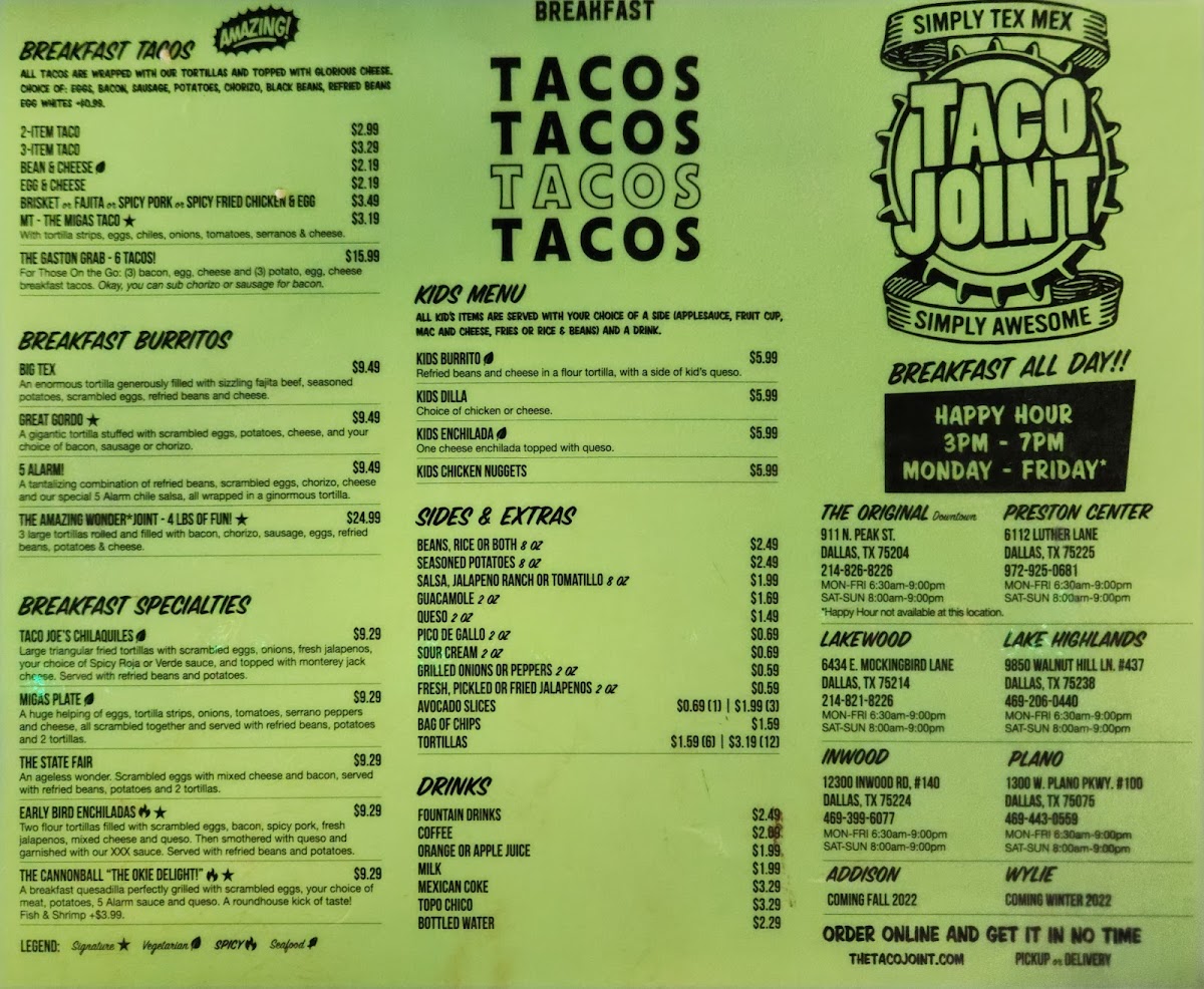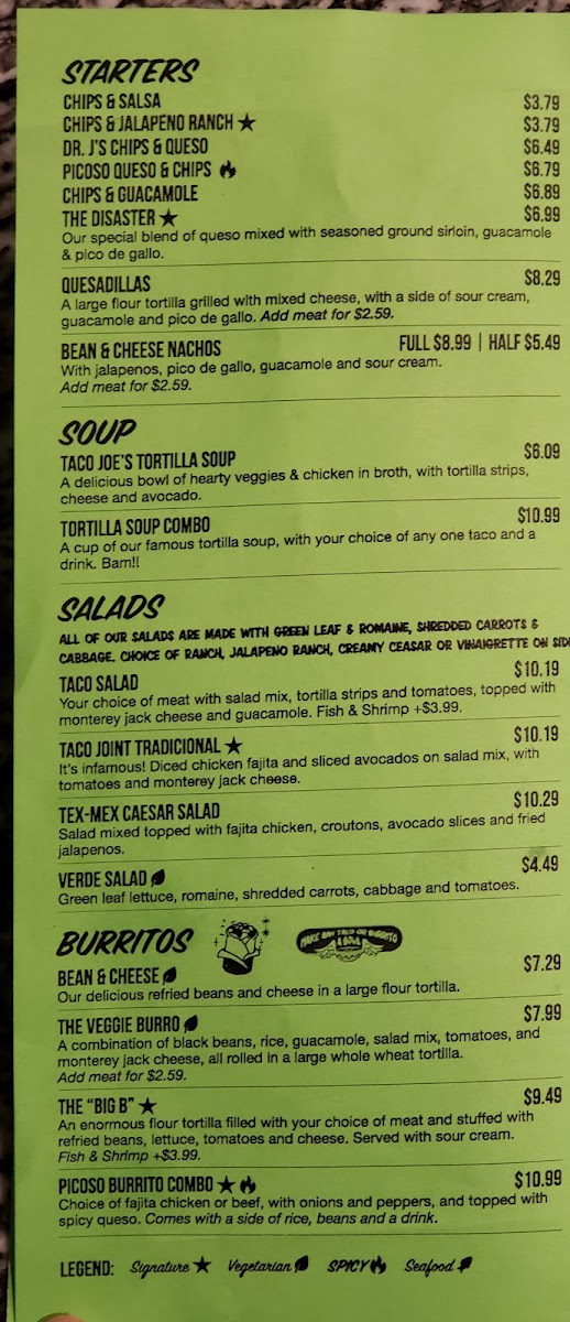 Welcome to Taco Joint Lakewood, a delightful Tex-Mex haven located at 6434 E Mockingbird Ln, Dallas. This vibrant eatery offers a diverse menu that caters to all cravings. Start with their The Disaster And Chips, a savory blend of queso, seasoned ground sirloin, and guacamole for just $9.59. For burrito lovers, the The Big B is an enormous flour tortilla filled with your choice of meat, complemented by refried beans, lettuce, and cheese, a true crowd-pleaser.